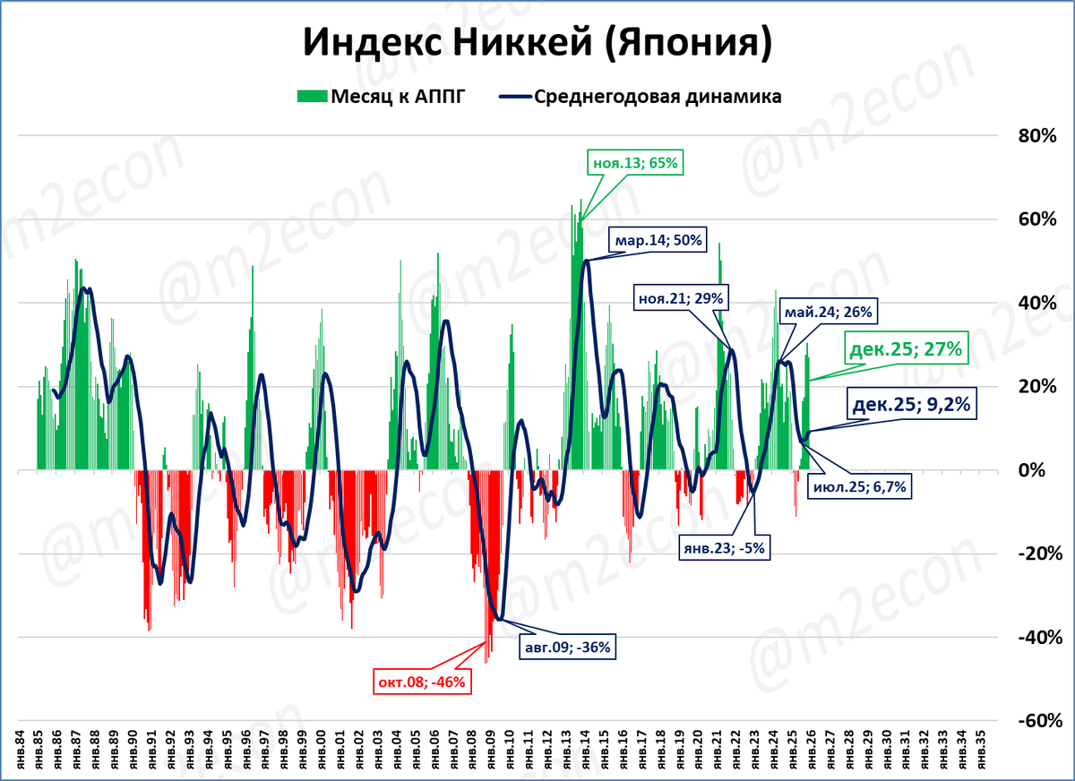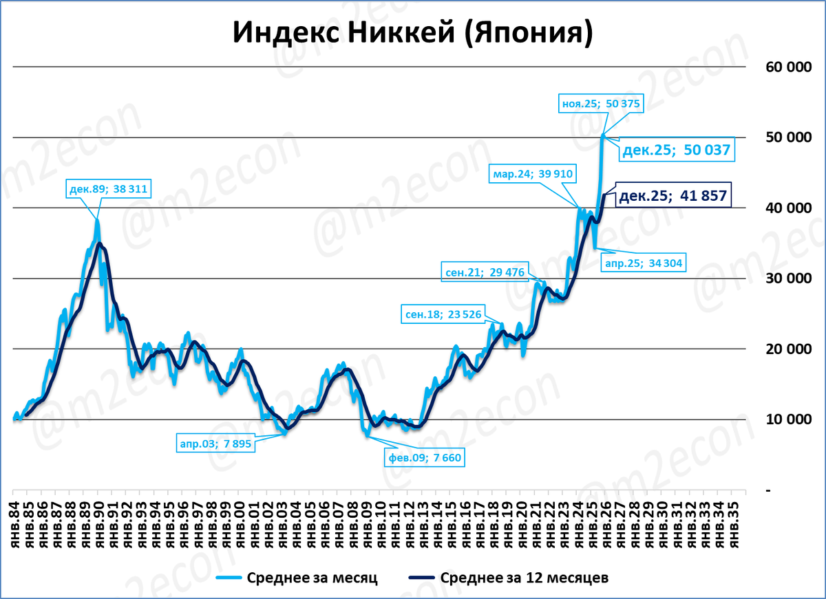 Исторический рекорд 1989 года (38,3 тыс.) был побит только через 35 лет, в 2024 году. Но затем индекс долго держался на отметке чуть ниже 40 тыс. И только сейчас можно сказать, что результат 1989 года не только повторен, но и значительно превзойдён.