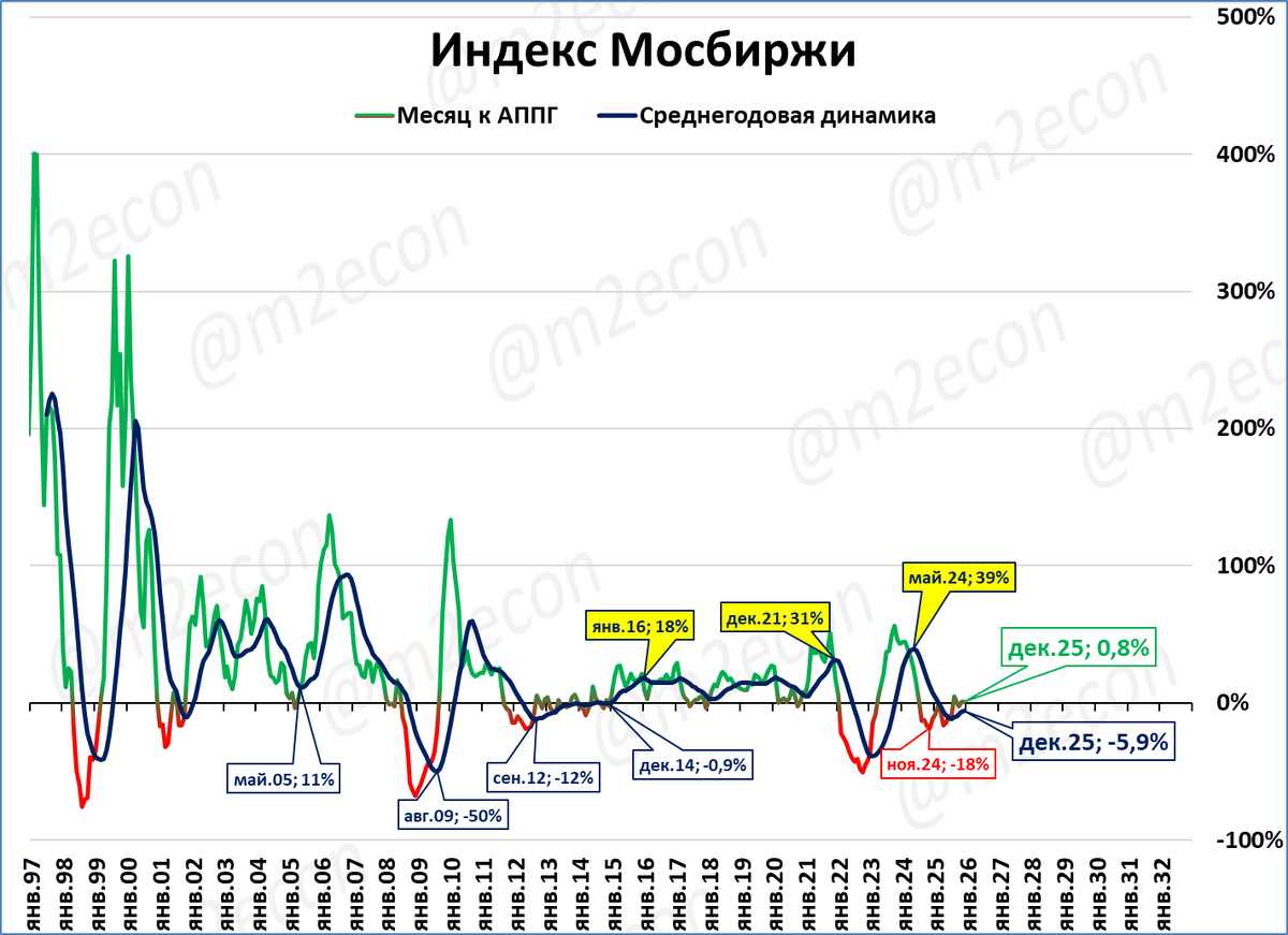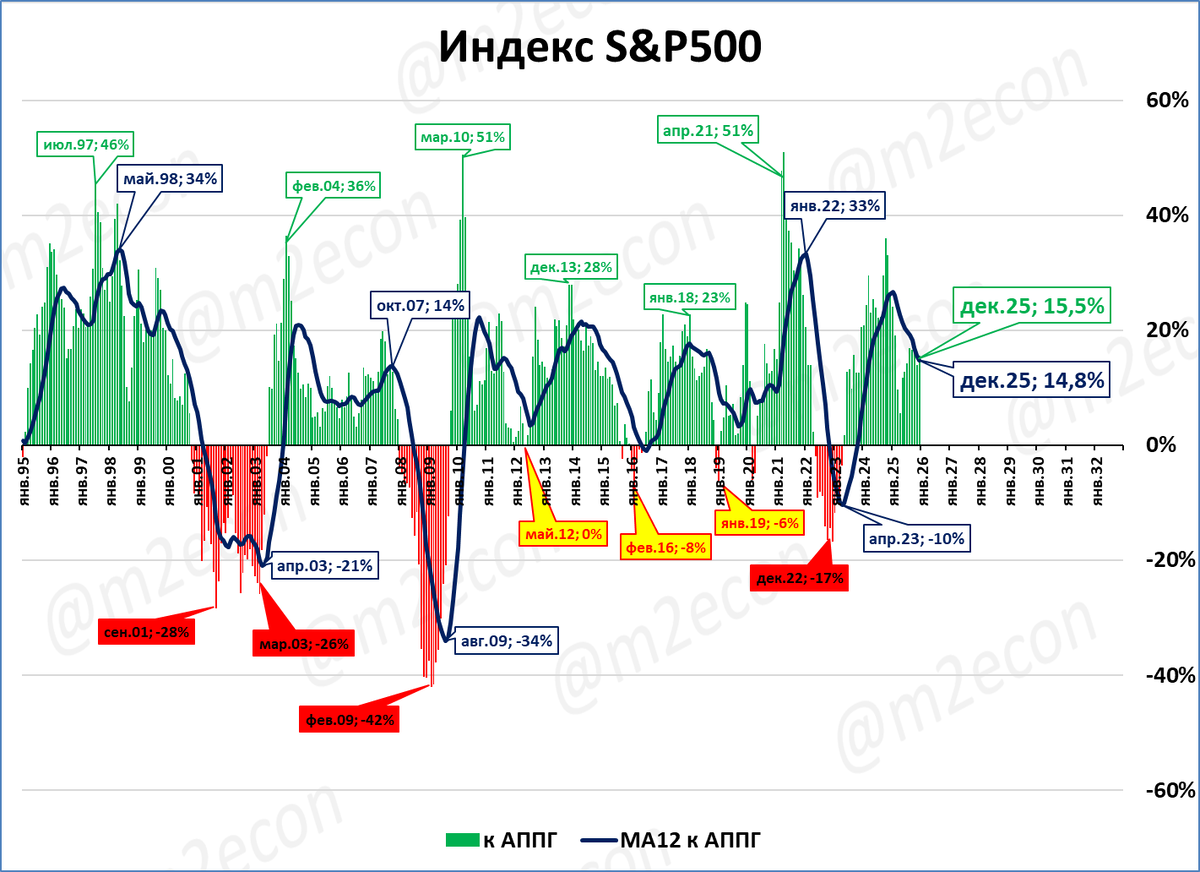 «Медвежьи рынки» (полноценные падения индекса) показаны красными выносками. Визуальный ориентир – красная «борода» и синяя линия ниже нулевой отметки.