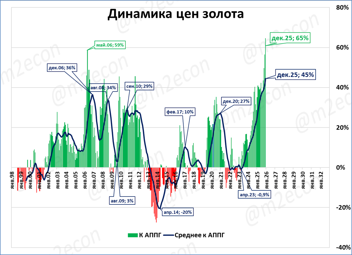 Цены на золото растут. Пока нет даже замедления темпов роста (текущие темпы выше среднегодовых). Рост ускоряется.