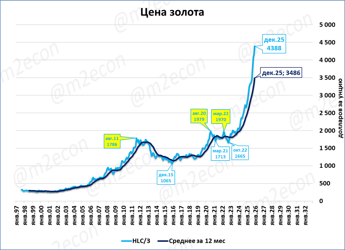 Цена золота в декабре составила 4 388 долларов за унцию. Это +65% к декабрю прошлого года и новый исторический рекорд.