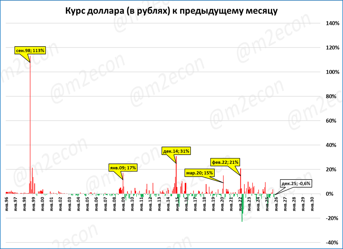 Резкие скачки курса (15% и более к предыдущему месяцу) показаны жёлтыми выносками.