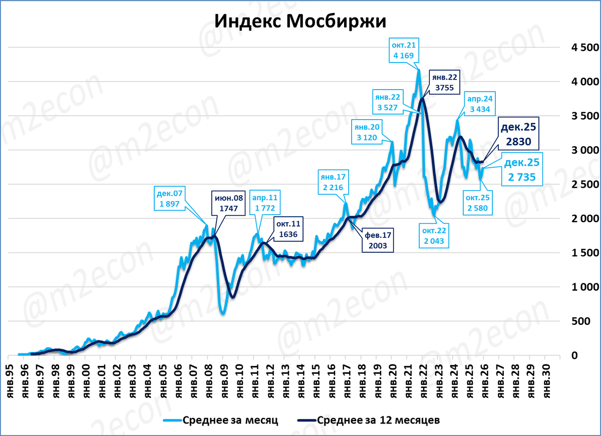 Индекс Мосбиржи в декабре составил 2 735 пунктов, (+0,8% годовых). Индекс Мосбиржи выше, чем в декабре прошлого года (2 712), и это второй месяц роста.