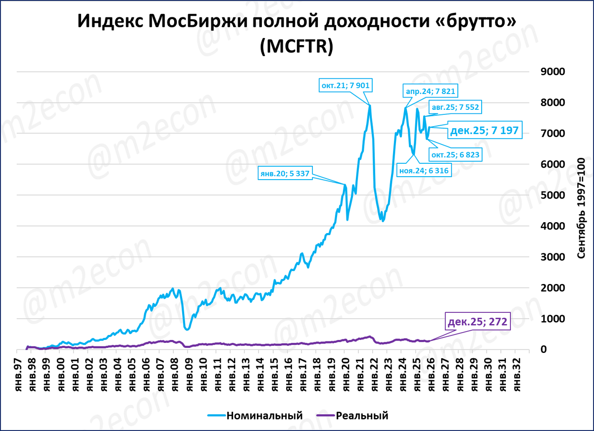Индекс полной доходности учитывает выплаты дивидендов. По итогам декабря 2025 года индекс полной доходности вырос в 72 раза с сентября 1997 года (со 100 до 7 197 пунктов; голубая линия на графике). Для сравнения: «стандартный» индекс Мосбиржи вырос «всего» в 27 раз за то же время (около 2 700 п. сейчас против 100 пунктов в начале).