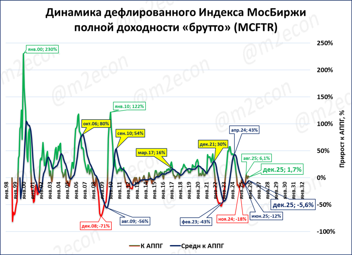 Наблюдение: динамика реального индекса полной доходности почти совпадает с «классическим» индексом Мосбиржи, потому что инфляция снижает индекс, но дивиденды повышают его примерно на такую же величину.