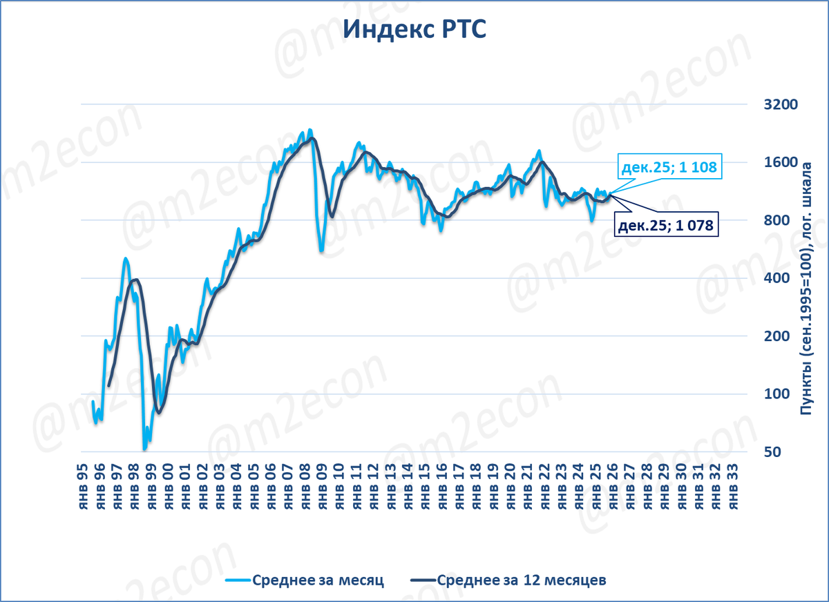 Индекс РТС в декабре составил 1 108 пунктов (1 042 пункта в ноябре). Рост к декабрю прошлого года составил 32%. Такой высокий рост произошёл благодаря низкой сравнительной базе декабря прошлого года, когда индекс провалился из-за ослабления рубля.