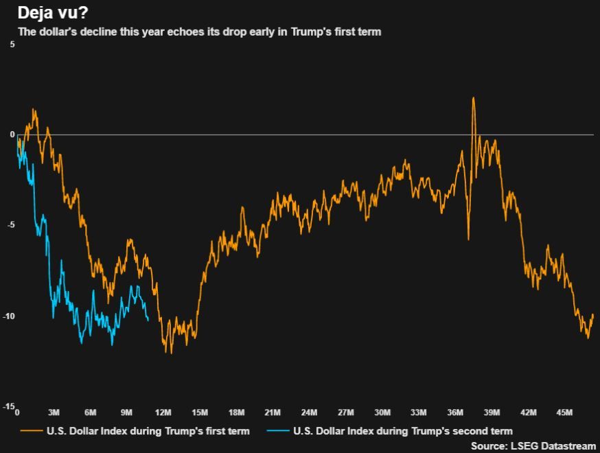 Падение доллара в этом году повторяет его снижение в начале первого срока Трампа.