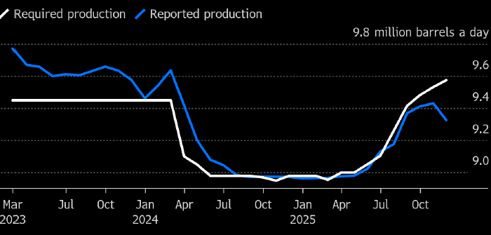 В прошлом месяце страна добывала в среднем 9,326 млн баррелей нефти в день (без учета конденсата). Это более чем на 100 тысяч б/д ниже показателя ноября и почти на 250 тысяч б/д меньше квоты России в рамках ОПЕК+.