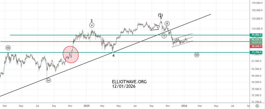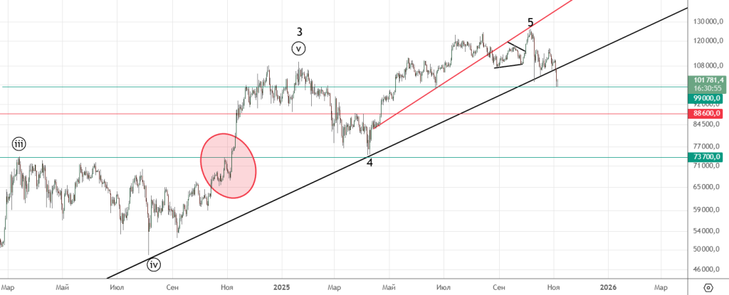 Пробита долгосрочная трендовая черным , это очень важный сигнал, отскочили от 99000 , возможно еще протестируем трендовую снизу . Если пойдем дальше вниз , то до 89000 — 88000 ничего не держит.