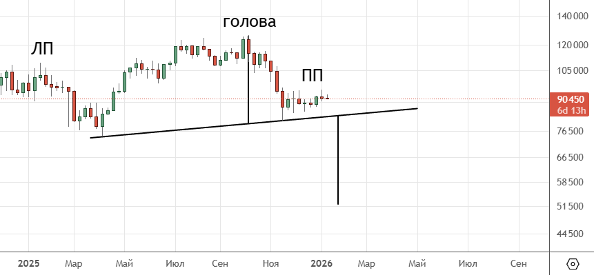 Также можно заметить формирование модели «голова и плечи» . Для отработки надо на хороших объемах пробивать линию шеи (район 82000) , тогда цель отмеренного хода примерно 52000