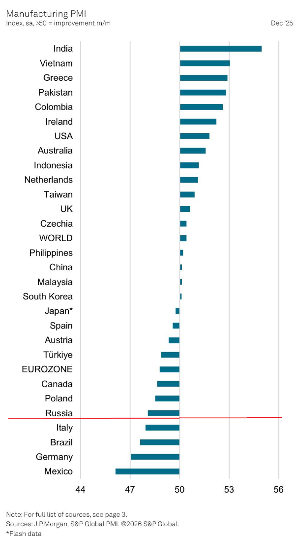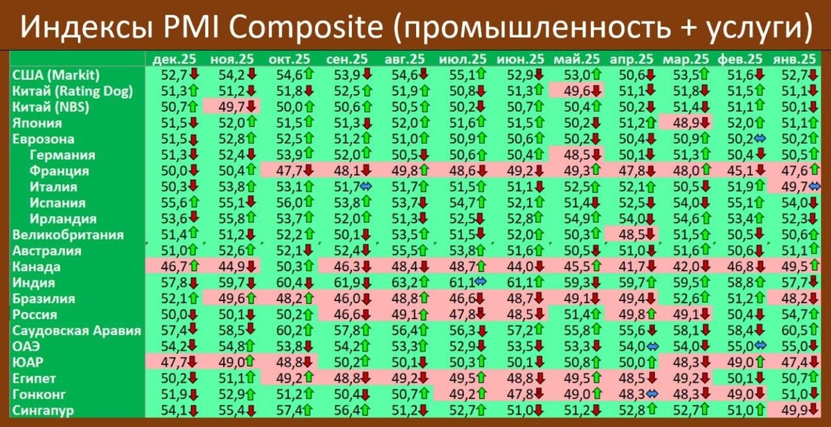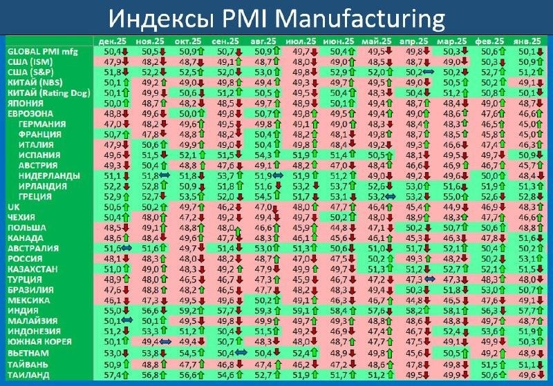 В декабре индекс деловой активности в мировой обрабатывающей промышленности (PMI manufacturing) составил 50,4 пункта по сравнению с 50,5 в ноябре. Выше 50 пунктов = рост деловой активности. В целом же в экономике (с учётом сектора услуг) ситуация ещё лучше.