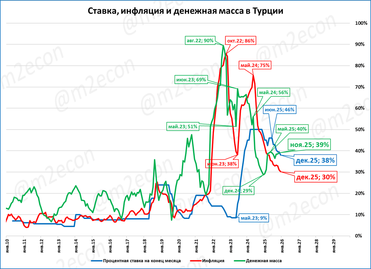 В ноябре рост денежной массы Турции составил 39% к ноябрю 2024 года.