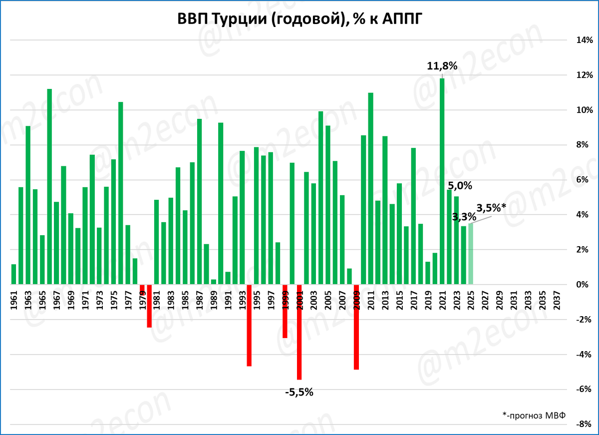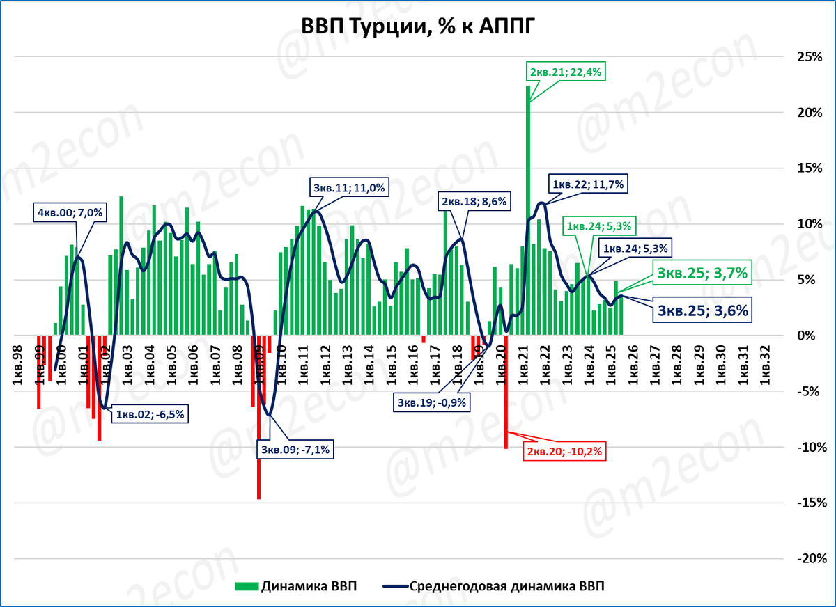 Однако в целом тренд (синяя линия) говорит об ускорении роста. По итогам 2025 года МВФ прогнозирует рост экономики Турции на 3,5%.