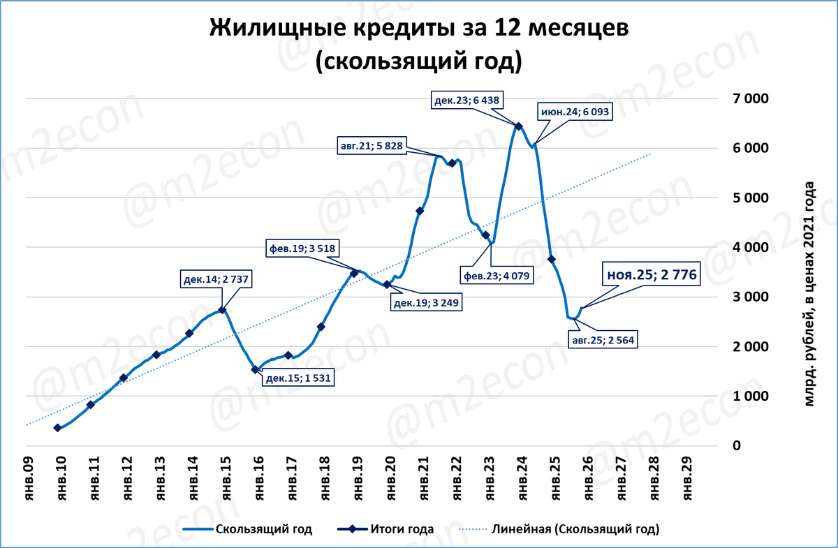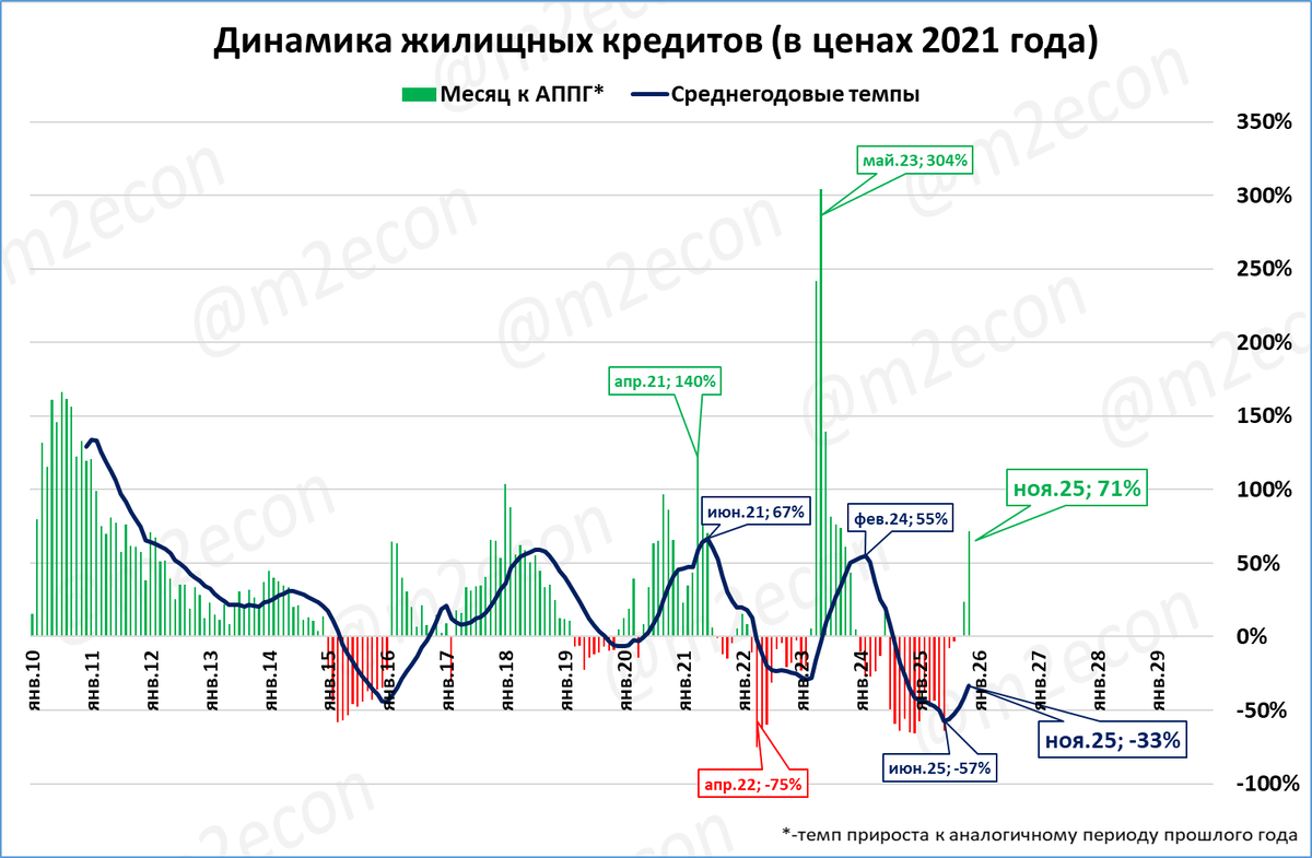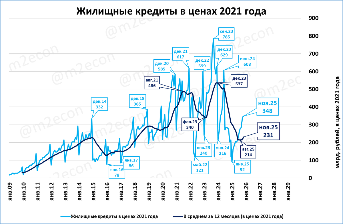Нас, как всегда, интересуют показатели в реальном выражении. В постоянных ценах 2021 года объём жилищных кредитов составил 348 млрд. рублей.
