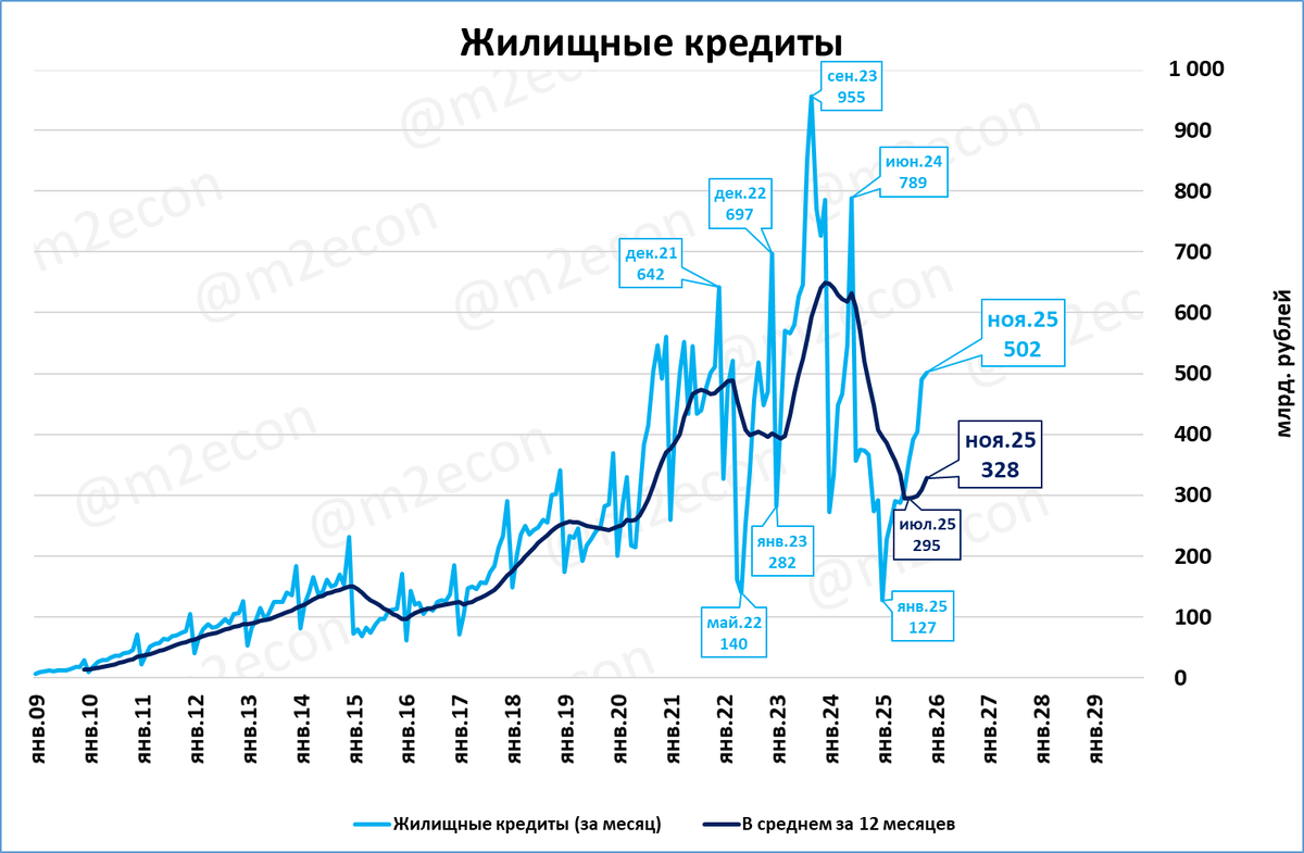 По данным ЦБ в ноябре было выдано жилищных кредитов на 502 млрд. рублей.