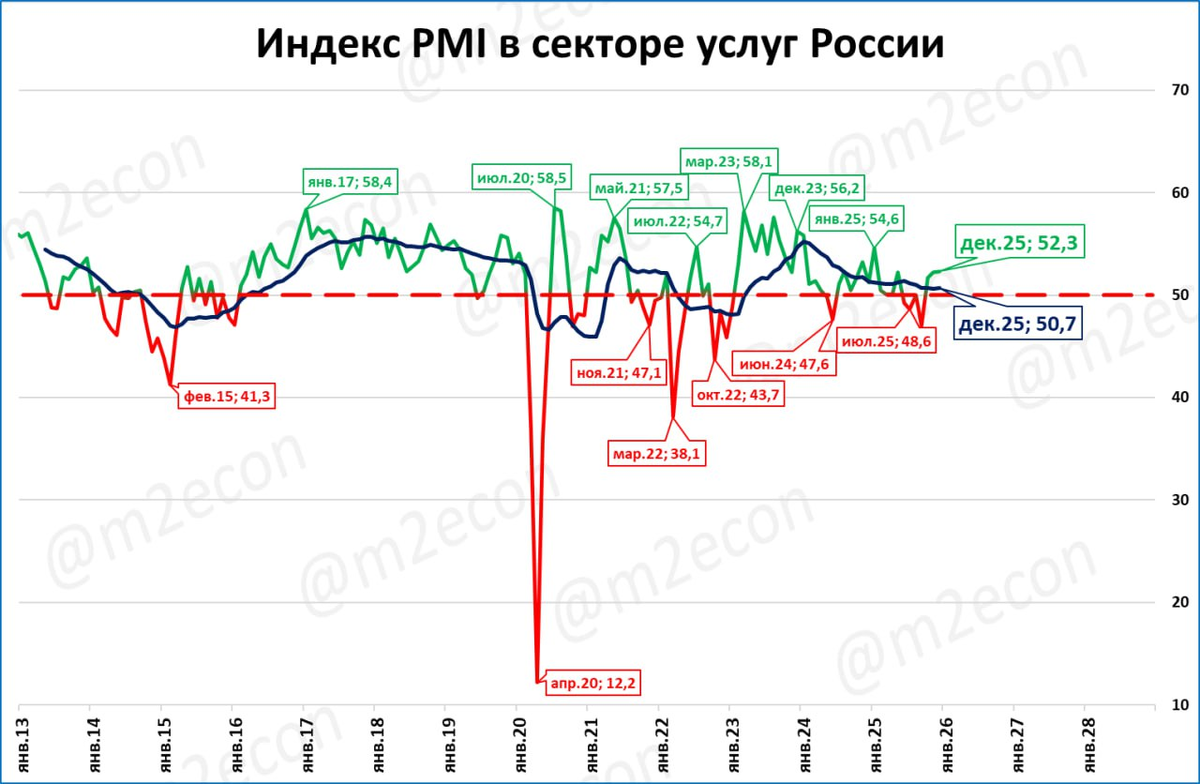 Напомним, что индекс выше 50 пунктов означает рост деловой активности, а ниже – падение.