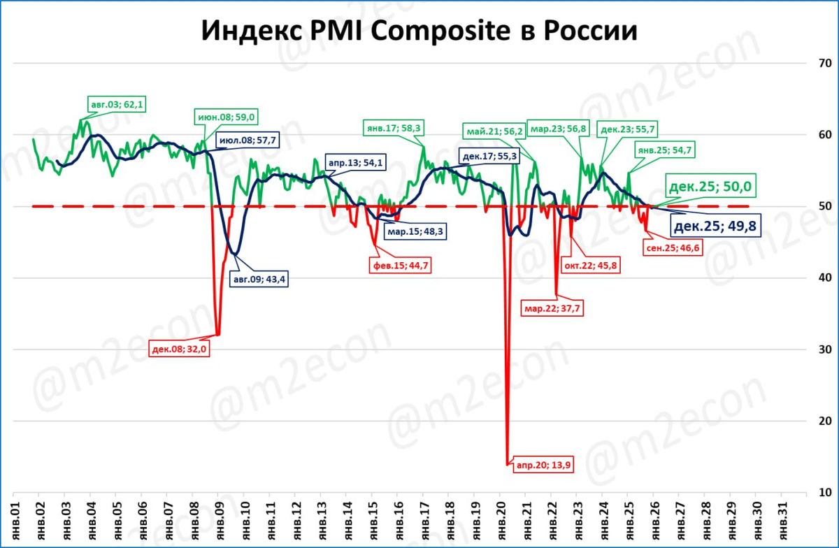 Композитный индекс, отражающий ситуацию в экономике в целом, находится на границе между ростом и падением, то есть на отметке ровно 50 пунктов.