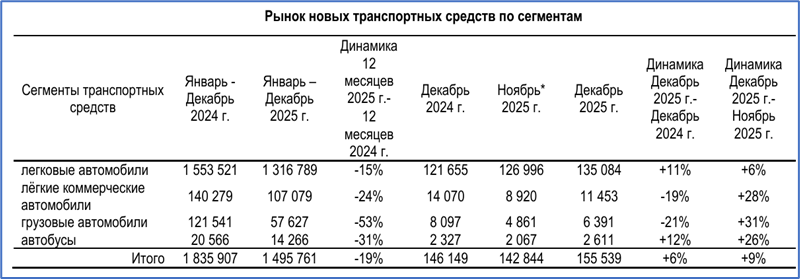 Отдельно отметим итоги года на рынке легковых автомобилей: 1,32 млн. Это на 15% меньше, чем в 2024 году (1,55 млн.).