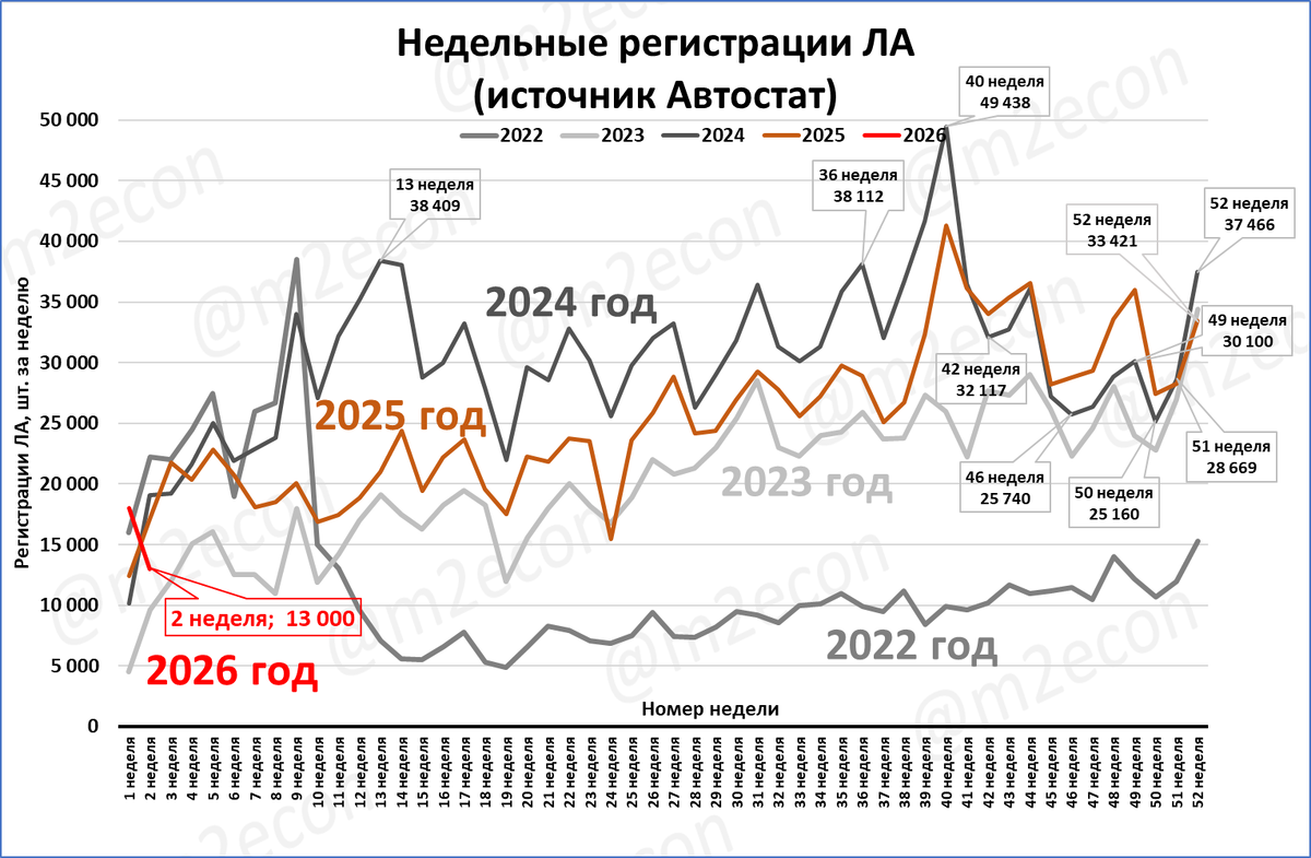 За первые две недели 2026 года было зарегистрировано 31 005 штук легковых автомобилей, а за первые две недели прошлого года было зарегистрировано 29 250 штук.