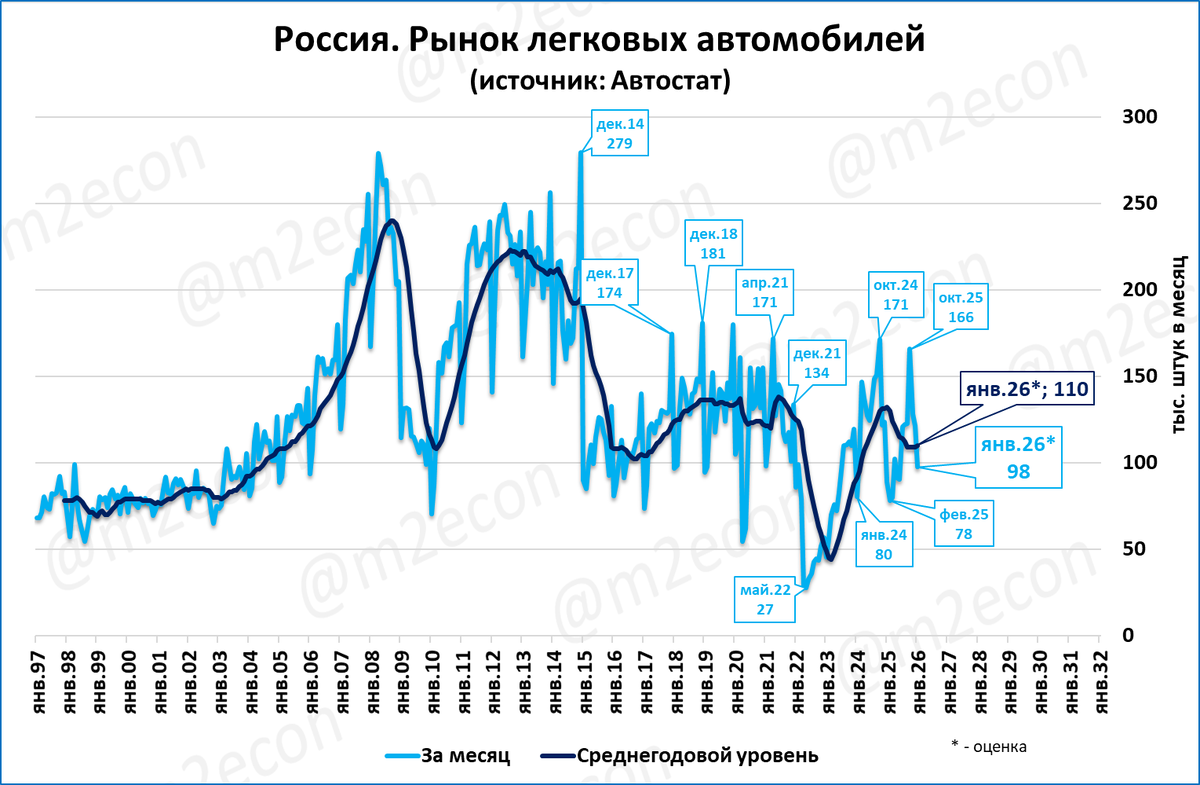 Рынок легковых автомобилей, судя данным двух первых недель 2026 года, в январе составит 98 тыс. (+9%).