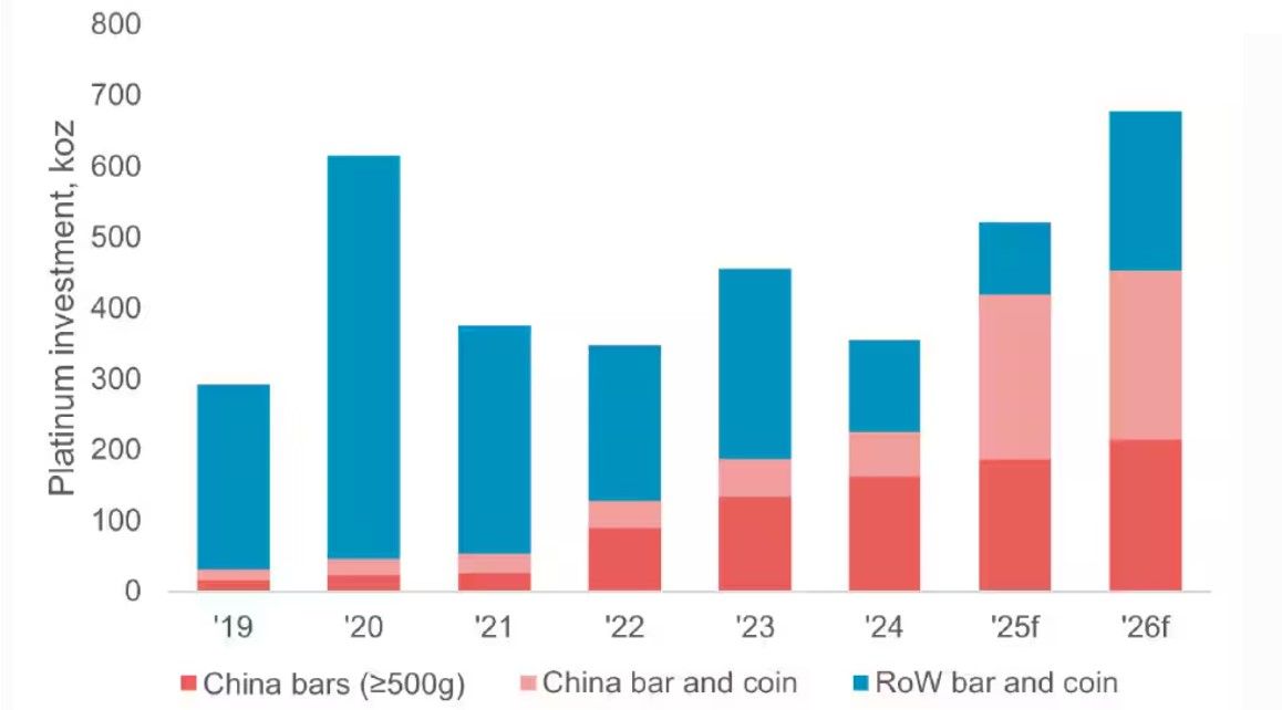 Ниже представлен график динамики инвестиционного спроса в Китае на платину в сравнении с глобальным инвестиционным спросом. На нем видно, как Китай в 2025 году составил 60–70% глобального спроса на монеты и слитки (bar & coin demand): глобальный Net Investment около 700 тыс. унц., из которых у Китая около 300 тыс. унц. На графике видно, насколько вырос китайский инвестиционный спрос по сравнению со слабой динамикой в 2019–2022 гг.