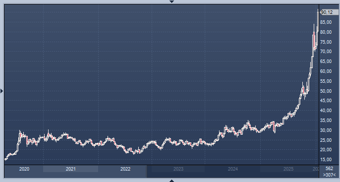 Спотовое серебро увеличилось на 3,6% до 90,11 долларов за унцию, что с начала года составило почти 27% роста.