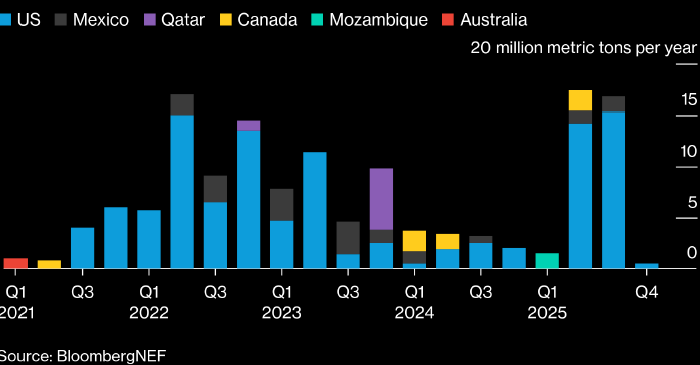 В четвертом квартале 2025 года объем объявленных обязывающих контрактов на покупку СПГ с проектов США, по которым еще не принято инвестиционного решения, рухнул до 0,5 млн тонн в год. Это — самое низкое значение с первого квартала 2024 года, когда оно составило те же 0,5 млн тонн в год, пишут аналитики BloombergNEF.