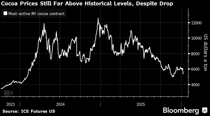 Котировки фьючерсов на какао декабре 2024 года достигли исторического максимума после неурожаев в Западной Африке. Ценовой шок побудил потребителей сократить потребление шоколада, а производители конфет изменили рецепты, используя более дешевые заменители и добавляя в состав различные ингредиенты, например, в изделиях возросла доля орехов. Хотя фьючерсы упали более чем вдвое по сравнению с пиком, цены все еще остаются высокими по историческим меркам, и переработчики все еще перерабатывают объемы, закупленные по гораздо более высоким ценам, нежели сейчас.