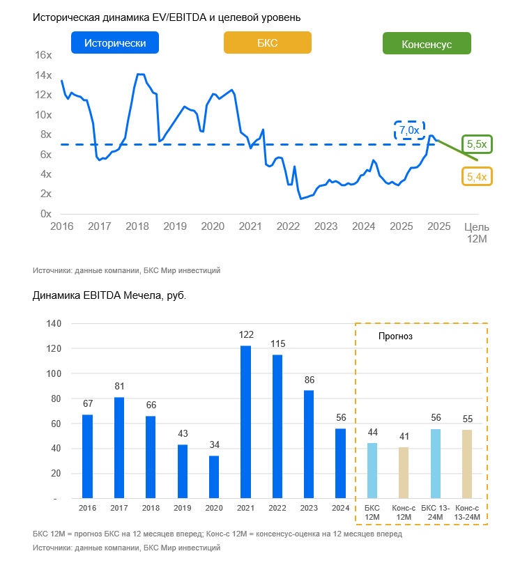 Восстановление цен на угольную и стальную продукцию. Угольная и металлургическая отрасль продолжают находится под давлением на фоне кризиса. При нынешних ценах и курсе рубля, по нашим оценкам, у добывающего сегмента прогнозная рентабельность по EBITDA на 2025 г. отрицательная, рентабельность стального сегмента — в пределах 5%. Постепенное восстановление цен на коксующийся уголь позволит компании постепенно усиливать финансовые результаты в добывающем сегменте. При дальнейшем снижении ключевой ставки и начале нового стройсезона цены на сортовой прокат тоже начнут расти, что поддержит металлургический сегмент Мечела.