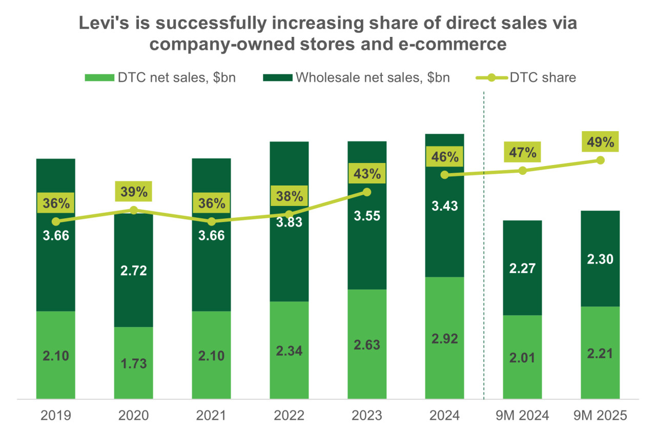 Одной из ключевых целей Levi’s является увеличение доли сегмента продаж напрямую потребителю (DTC). Хотя оптовые продажи по-прежнему приносят более половины выручки, сегмент DTC значительно опережает их по темпам роста. В частности, за первые девять месяцев 2025 года выручка в сегменте DTC выросла на 10,3% год к году (или на 10,6% в органическом выражении), тогда как в оптовом канале рост составил всего 1,2% (5,7% органически).