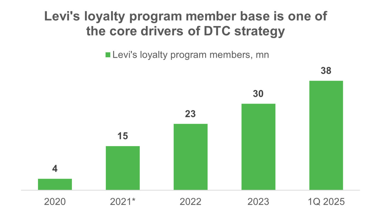 Мы полагаем, что бренд, являющийся неотъемлемой частью американской культуры, только выиграет от максимального расширения собственного присутствия. Фокус внимания на DTC-каналах укрепит связь между потребителем и брендом, превращая его в полноценный Lovemark в гораздо большей степени, чем это возможно при работе через посредников. Подтверждением служат результаты программы лояльности Red Tab. Предлагаемые бонусы стандартны, но эффективны: более значительные скидки, доступ к лимитированным коллекциям, бесплатные доставка и возврат. Эти простые инструменты удержания клиентов позволили компании расширить базу участников программы с 4 млн человек в 2020 году до 38 млн к 1-му кварталу 2025 года.