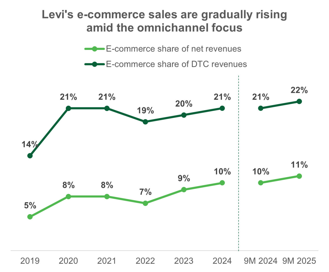 Электронная коммерция занимает центральное место в стратегии продаж Levi’s. Если в 2022 финансовом году на онлайн-продажи приходилось лишь 7% чистой выручки, то за девять месяцев 2025 года этот показатель вырос до 11% от всех продаж и составил около 22% от выручки сегмента DTC. Онлайн-ритейл является самым динамичным звеном прямых продаж: в последнем квартале цифровые продажи выросли на 18% в годовом исчислении против роста на 11% в сегменте DTC в целом.