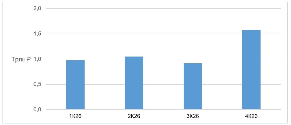 Очевидно, что такой объем средств станет мощным подспорьем для программы по размещению гособлигаций в наступившем году, ведь можно ожидать, что значительная часть средств будет реинвестирована обратно в рынок. Например, как видно на графике ниже, объем купонных платежей и погашений в 1К26 должен составить почти 1 трлн ₽. В случае реинвестирования этих средств и реализации планов по размещению нового госдолга, подавляющая часть прироста рынка ОФЗ по итогам квартала будет обеспечена за счет «старых» денег. В целом, и погашения, и купонные платежи послужат буфером от потенциального «залива» рынка (насколько мы понимаем, программа по размещению госдолга в 2026 году также обещает быть масштабной), что поддержит ценовые уровни в секторе.