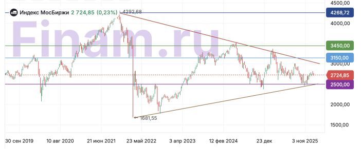 В первой половине года скорее всего увидим продолжение вялой динамики в диапазоне 2500-3150 пунктов, о чем также говорит технический анализ ― выход из долгосрочного симметричного треугольника будет проходить в последней четверти фигуры, что указывает на вероятность продолжения флэта.