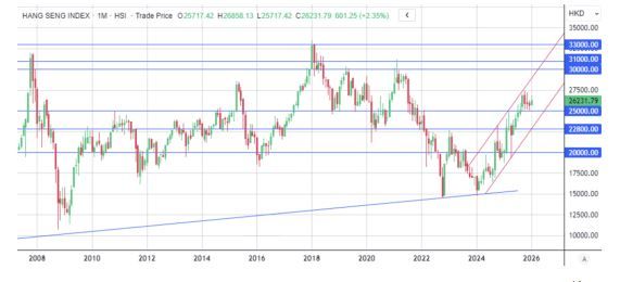 В базовом сценарии в 2026 году мы ожидаем умеренного роста китайских индексов. Гонконгский индекс Hang Seng пребывает в консолидации после ралли, но признаков к развороту пока нет. До конца 2026 года индекс может взойти в район 30 000-31 000 пунктов (потенциал 14-18%):