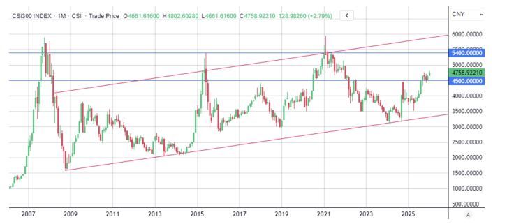 Материковый индекс CSI 300 транслирует схожую картину. Идет тестирование максимумов 2025 года, пробитие которых откроет путь в район 5400 пунктов (потенциал 13%).
