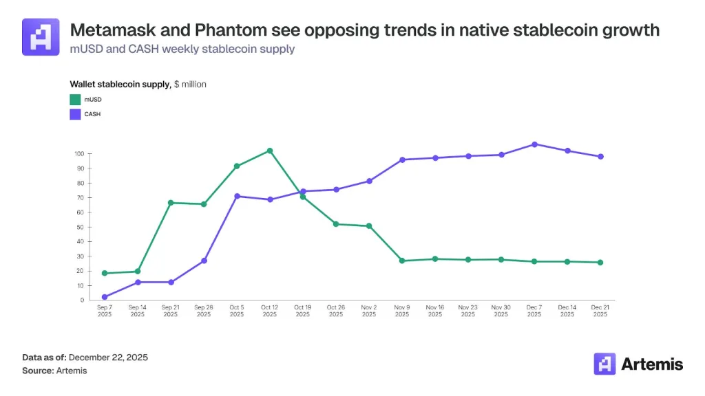 Однако успехи проектов разнятся. Объем выпуска CASH от Phantom стабильно рос на протяжении квартала, достигнув $100 млн к концу года. Динамика mUSD от MetaMask была обратной: после октябрьского максимума в $100 млн эмиссия актива сократилась вчетверо — до $25 млн.