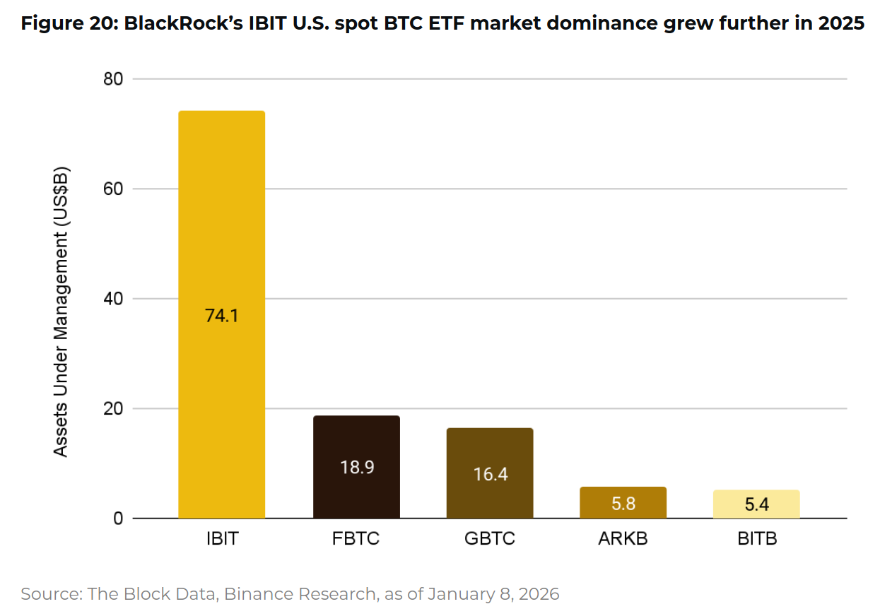 При этом институциональный интерес усилился. Биткоин-ETF привлекли более $21,3 млрд чистого притока. BlackRock iShares Bitcoin Trust (IBIT) аккумулировал около $25 млрд — больше, чем крупнейший золотой ETF (GLD) за тот же период.