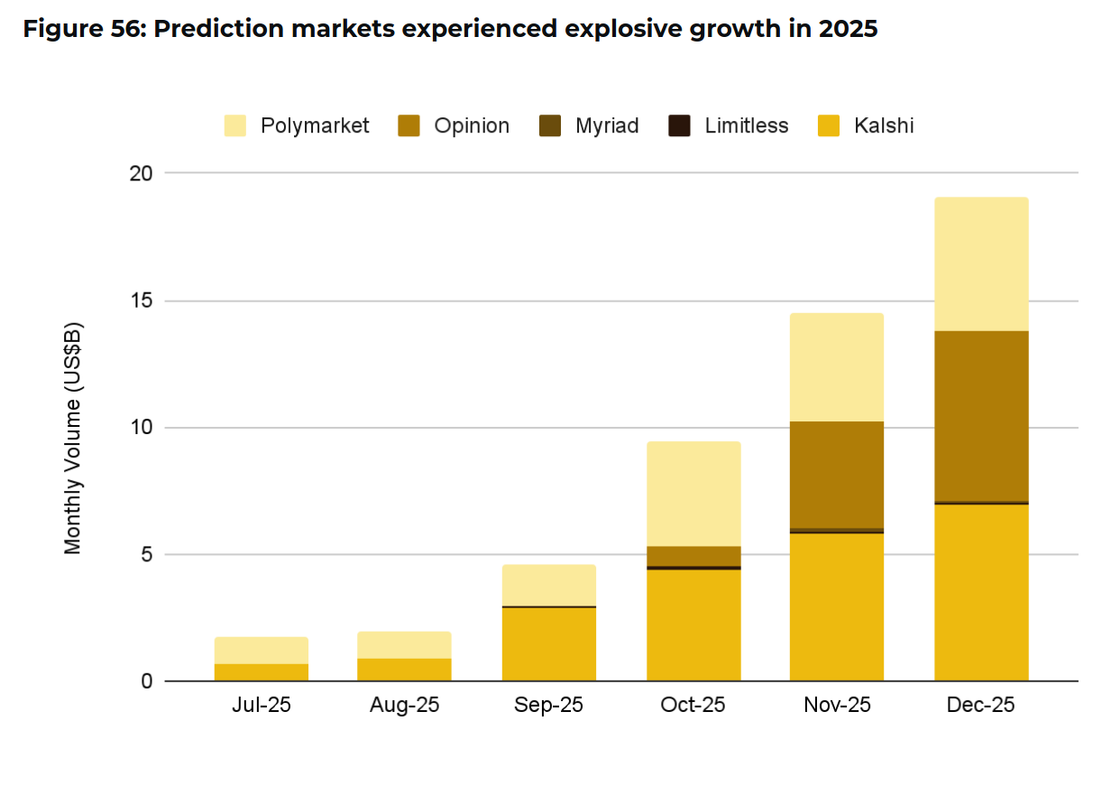 Рынки предсказаний показали взрывной рост. Объем торгов Polymarket и Kalshi составил $51 млрд. Opinion на BNB Chain в декабре достиг объема около $7 млрд, захватив треть рынка.