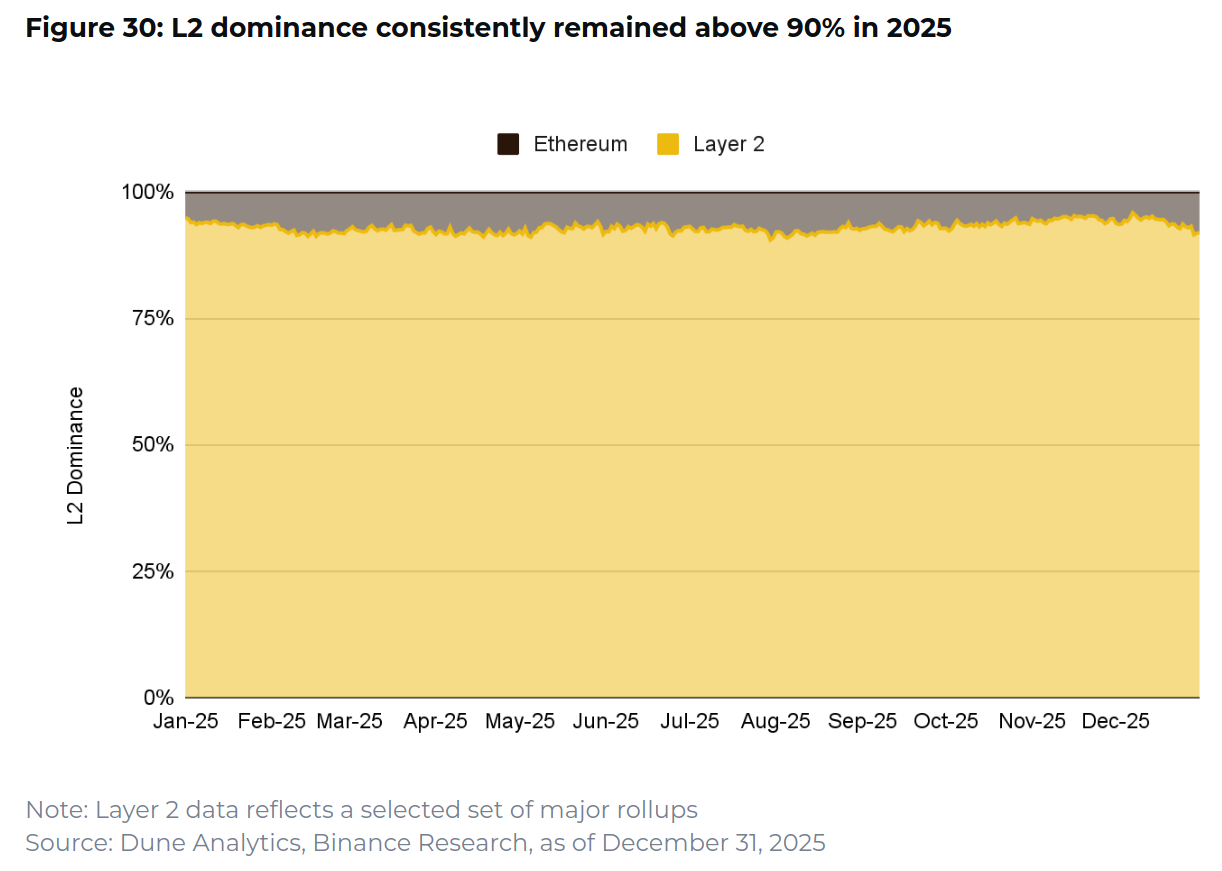 К концу года роллапы среди крупнейших L2-решений обеспечивали свыше 90% всей транзакционной активности в экосистеме Ethereum. Причем даже эта цифра не отражает полной картины: при учете более широкого круга L2 их вклад был бы еще выше.