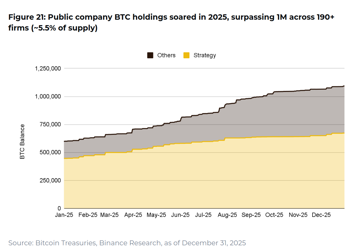 Корпоративные держатели накопили свыше 1,1 млн BTC, что эквивалентно примерно 5,5% от общего предложения. Strategy увеличила резервы на 226 100 BTC и теперь владеет 672 500 BTC — около 3,4% всего предложения биткоина.