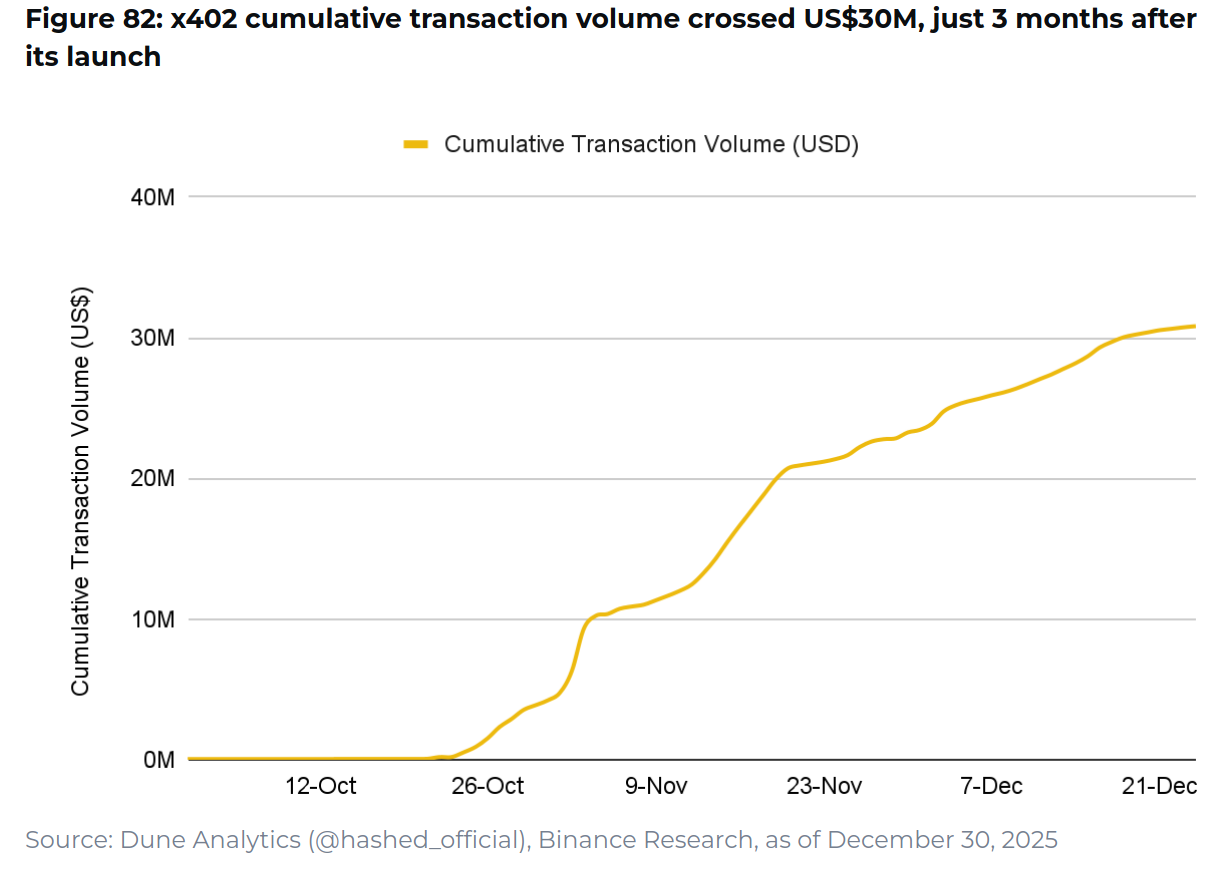 Протокол x402 обработал более 100 млн платежей и превысил $30 млн кумулятивного объема за три месяца после запуска. Ежедневный объем транзакций стабильно превышал 1 млн.