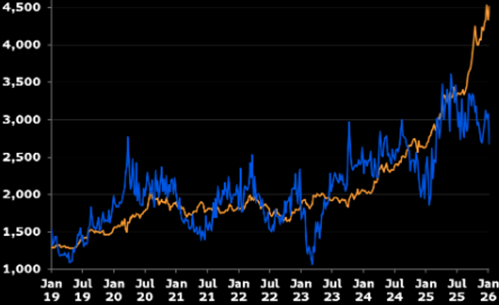 Эксперты BI объясняют «завышенную» цену золота (относительно «справедливой») как традиционной защитной функцией драгметалла в условиях повышенных рисков, так и общим усилением интереса к товарным активам со стороны инвесторов, желающих диверсифицировать свои портфели. Совокупность данных факторов вкупе с неопределенностью относительно дальнейшей политики ФРС после грядущей смены ее руководства все еще могут подтолкнуть золото к $5000 за унцию в текущем году, полагают аналитики компании.
