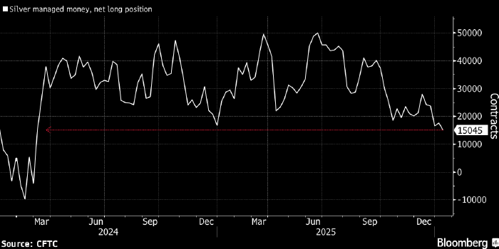 На неделе до 13 января крупные спекулянты, вроде хедж-фондов, сократили объем чистой длинной позиции в серебре на 15%, сообщила вечером пятницы американская Комиссия по торговле товарными фьючерсами (CFTC). Вследствие данного события показатель опустился до 22-месячного минимума, пишет Bloomberg.