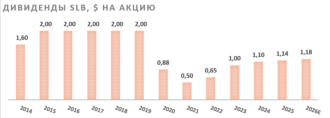 Сильная сторона SLB — высокие для сектора выплаты акционерам. Компания постепенно повышает объем дивидендов, но в большей степени фокусируется на обратном выкупе акций. Мы ожидаем, что на фоне неплохой генерации FCF суммарный объём дивидендов и байбэка в 2026 году составит $ 4-4,5 млрд, что соответствует доходности в 5,8- 6,5%.