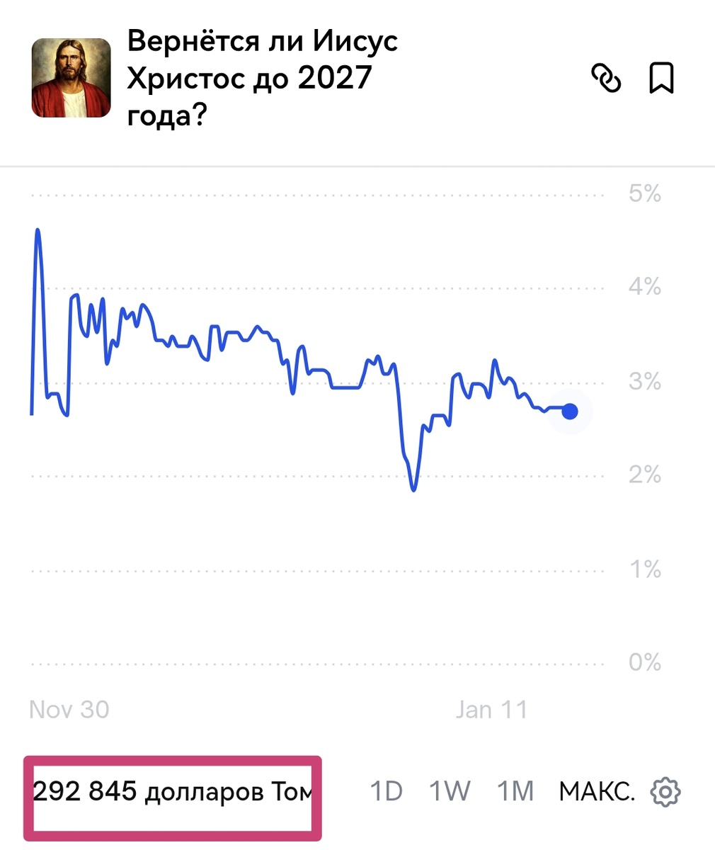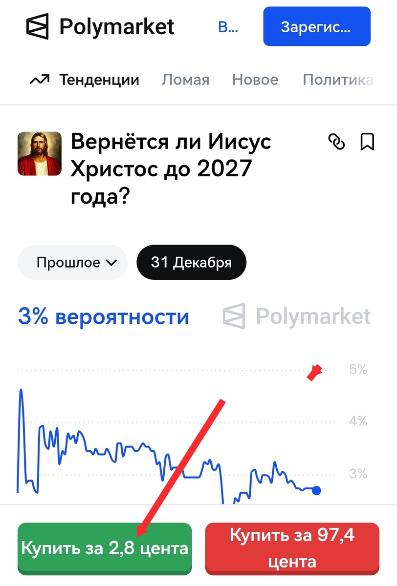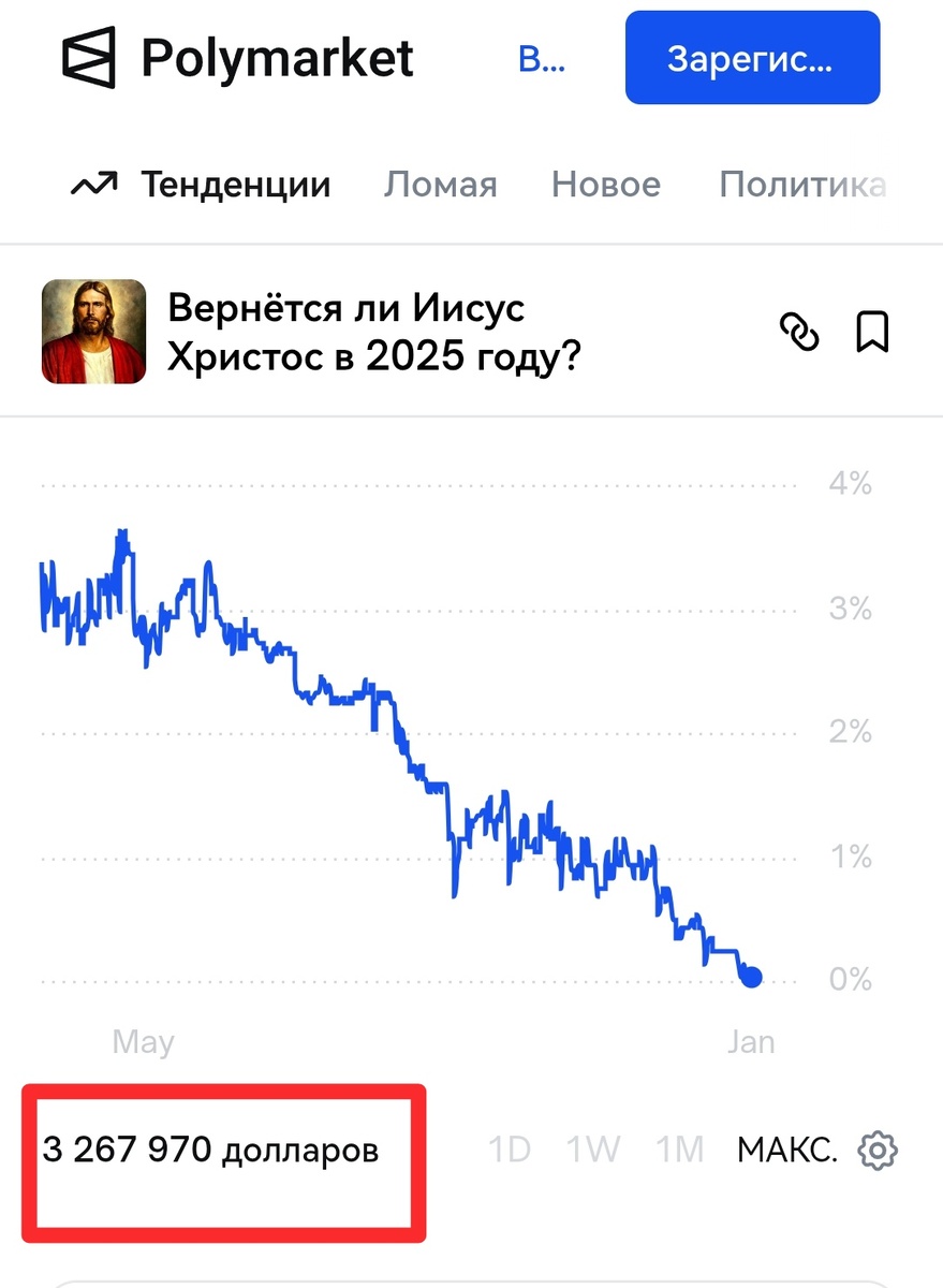 Если вы не верите в христианского бога, то можете на этом заработать. И это не шутка. На площадке полимаркет можно сделать ставку на то, что до конца года не будет второго пришествия Христа.
