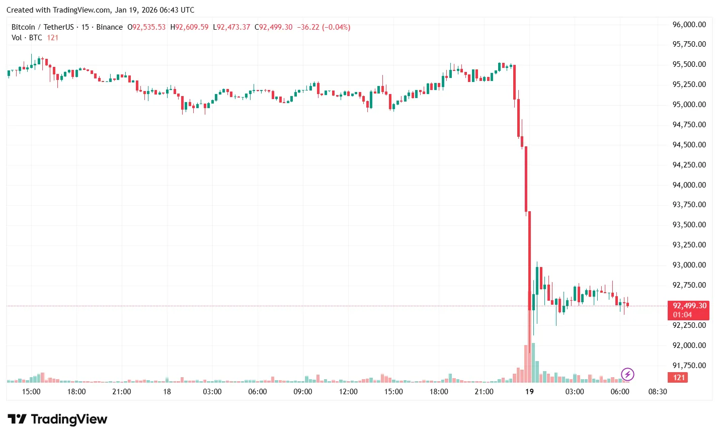 19 января курс первой криптовалюты опустился с отметки $95 467 до $92 263, потеряв 3,3%. Вслед за биткоином в «красную зону» ушли ведущие альткоины.