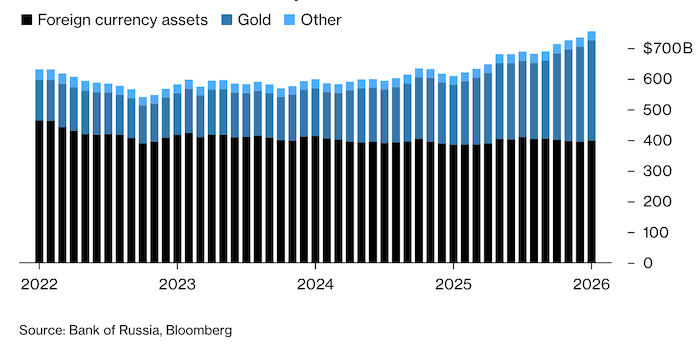По данным Банка России, на конец прошлого года международные резервы страны составляли $755 млрд, из которых $326,5 млрд приходилось на золото. С тех пор котировки металла выросли еще более чем на 8%, превысив отметку $4 700 за унцию.