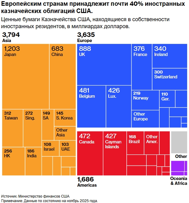 Аналитики Bloomberg считают, что угроза со стороны Европы продать казначейские облигации в ответ на действия Трампа маловероятна. Европа владеет казначейскими облигациями на сумму более 3,5 триллионов долларов, большая часть которых находится у частных держателей, а не у центральных банков. Координация продаж облигаций между частными держателями менее вероятна, чем приказ правительств своим центральным банкам.