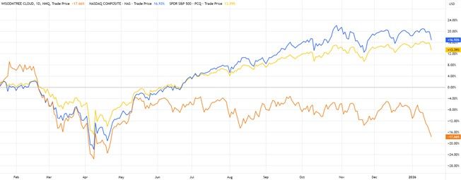 За последние шесть месяцев фонд существенно отставал от основных индексов на фоне нарастающего напряжения в секторе облачных технологий и искусственного интеллекта: коррекции высоко оцененных облачных игроков, усиление макрорисков и сжатие мультипликаторов привели к заметной волатильности. В то же время такое снижение не просто реакция рынка, а потенциальная возможность: при стабилизации настроений и возобновлении корпоративных расходов на облачные сервисы и AI-инвестиции высокая экспозиция WCLD к индексам дает фонду шанс на ускоренный восстановительный рост.