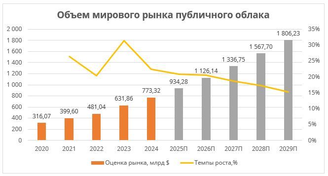 До 2030 г. мировой рынок облачных услуг продолжит расширяться на фоне устойчивого спроса на цифровые решения и автоматизацию. По разным оценкам, объем рынка к этому сроку может составить примерно от $1,5 трлн до $2 трлн при среднегодовом росте около 17 %. А более оптимистичные прогнозы предполагают, что он заметно превысит $2 трлн за счет внедрения искусственного интеллекта и цифровой трансформации предприятий.
